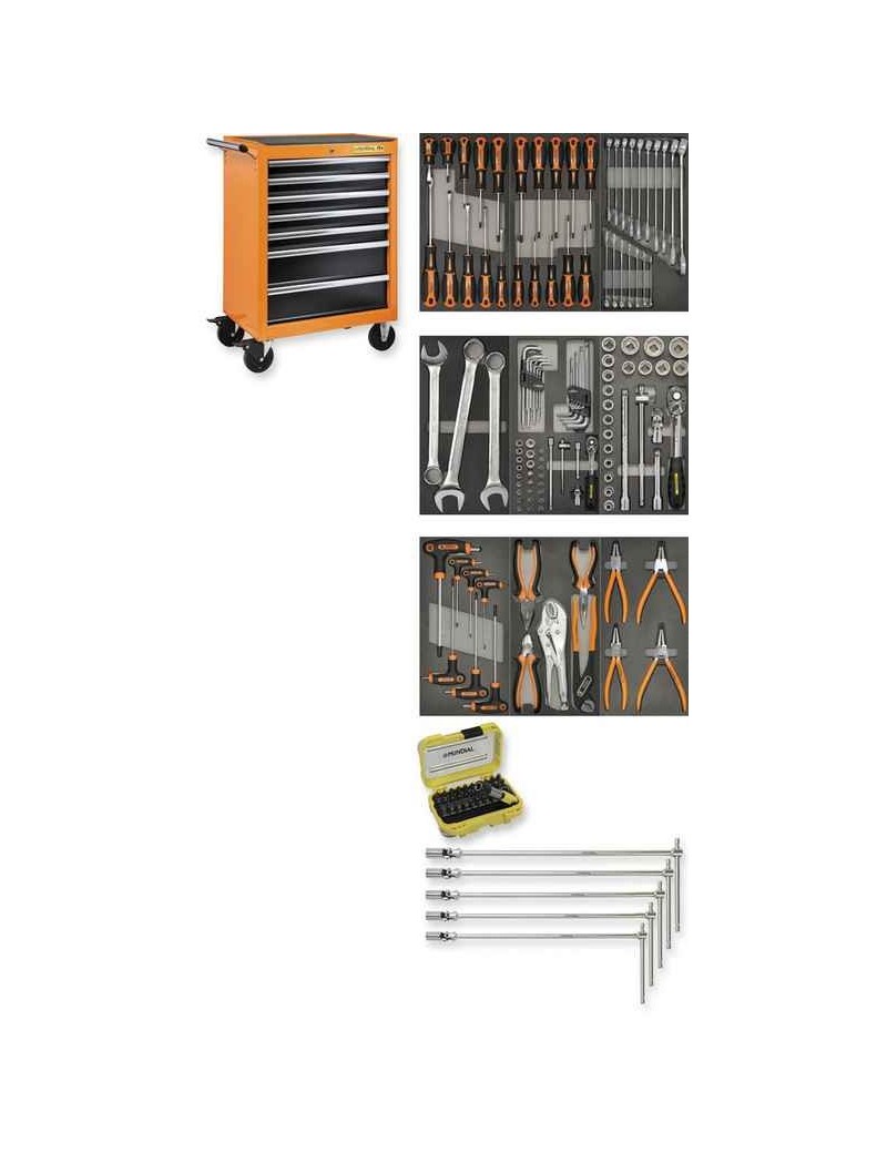 Carrello professionale 7 cassetti con piano di lavoro in gomma.5 cassetti h 65 x 385 x 5702 cassetti h 125 x 385 x 570Carico statico totale 700 kgGuide telescopiche a sfera2 ruote fisse - 2 ruote girevoli con frenoSerratura centralizzataPiano di lavoro in gommaPeso kg.60Carico statico kg. 700Ingombro mm 700x470x990