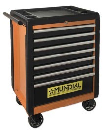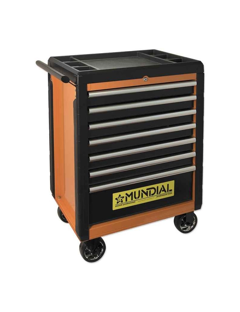 Carrello professionale 7 cassetti.5 cassetti h 65 x 385 x 5702 cassetti h 125 x 385 x 570Carico statico totale 700 kgGuide telescopiche a sfera2 ruote fisse - 2 ruote girevoli con frenoSerratura centralizzataPiano di lavoro in gommaPeso kg.60Ingombro mm 700x470x990