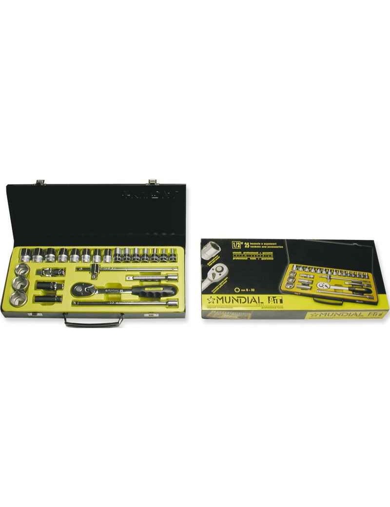 Cassetta in metallo contenente:Bussole: 8, 9, 10, 11, 12, 13, 14, 15, 16, 17, 18, 19, 21, 22, 24, 27, 30, 32.Cricchetto reversibile sgancio rapido e manico in plastica.Prolunga da mm125 e mm.50.Leva a T.Snodo cardanico.Chiave a bussola per candele 16, 21.