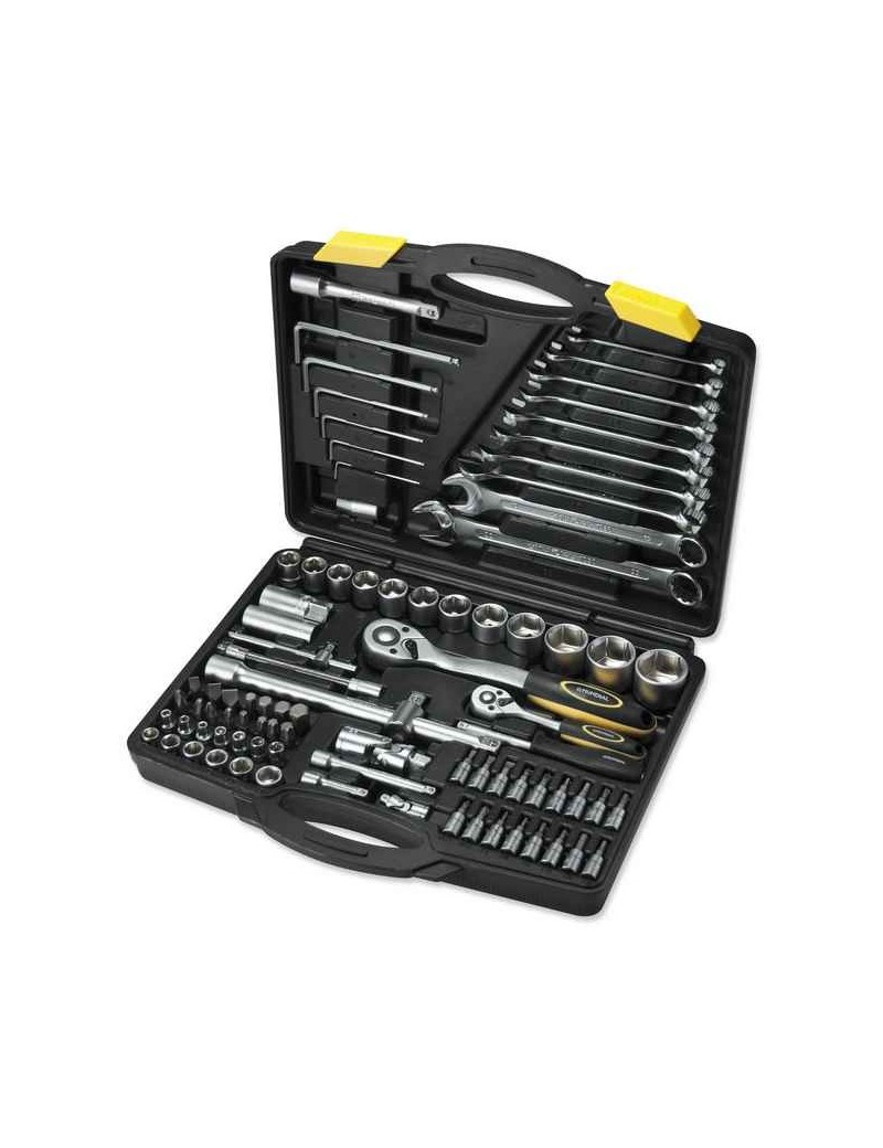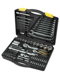 Valigetta contenente:Chiave maschio esagonale lunga estrem. sferica: 2 - 2,5 - 3 - 4 - 5 - 6.Chiave combinata CR-VA: 8 - 10 - 11 - 12 - 13 - 14 - 15 - 17 - 19 - 22.Chiave a bussola 1/4": 4 - 4,5 - 5 - 5,5 - 6 - 7 - 8 - 9 - 10 - 11 - 12- 13 - 14.Chiave a bussola 1/2": 14 - 15 - 16 - 17 - 18 - 19 - 20 - 22 - 24 - 27 - 30 - 32.Cricchetto reversibile da 1/4" e da 1/2" manico plastica e sgancio rapido.Prolunga 1/4" da mm 75 e mm 150, 1/2" da mm 75 e mm 150.Impugnatura porta bussola 1/4".Leva a T da 1/4" e da 1/2".Snodo cardanico da 1/4" e da 1/2".Chiave a bussola esagonale maschio 1/4": 3 - 4 - 5 - 6.Chiave a bussola a intaglio 1/4": 4 - 5 - 6.Chiave a bussola Phillips 1/4" PH: 1 - 2.Chiave a bussola Pozidriv 1/4" PZ: 1 - 2.Chiave a bussola Torx con foro 1/4" TX: 8 - 10 - 15 - 20 - 25 - 30.Inserti per viti 1/4" esagono 4 pz., intaglio 3 pz., PH 2 pz., PZ 2 pz., TX 4 pz.Chiave a bussola per candele 1/2" 16, 21.Adattatore 1/2" porta inserti.
