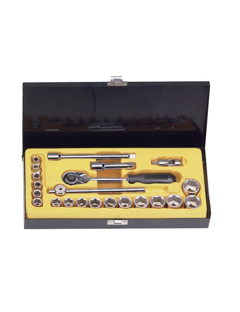 Cassetta in metallo contenente:Chiave a bussola: 6 - 7 - 8 - 9 - 10 - 11 - 12 - 13 - 14 - 15 - 16 - 17 - 18 - 19 - 22.Cricchetto reversibile con sgancio rapido e manico in plastica.Prolunga lunga mm75 e mm150.Leva a T.Snodo cardanico.Chiave a bussola per candele: 16 - 21.