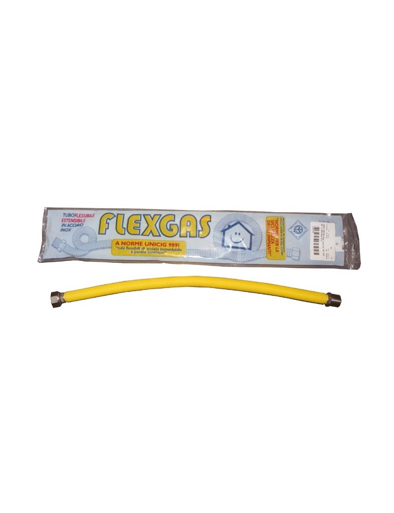 Confezionamento: in sacchetti con cavallotto.Caratteristiche costruttive:Tubo: acciaio Inox AISI 321 ad onde parallele.Spessore: < 0,21 mm.Maschio: acciaio Hi speed inox AISI 303. Filettatura: UNI-ISO 7/1Codulo portadado: acciaio Hi Inox AISI 303Dado: ottone nikelato.Filettatura UNI-ISO 228/1Guaina di protezione: maglia acciaio inox e guaina ignifuga ed atossica di colore giallo Guarnizioni: materiale plastico secondo normativa vigenteDiametro Interno (passaggio): 12 mmTrattamento termico: solubilizzazioneSaldatura: a mezzo T.I.G. senza apporto di materiale in atmosfera controllata Caratteristiche tecniche:Tipo: Flessibile non estensibile con protezione plastica esterna e maglia in acciaio inox Pressione massima di esercizio: 6 barTemperatura di esercizio: -20 °C / +120 °CRaggio minimo di curvatura: 1,5 volte il diametro esternoMateriale a contatto con il gas: acciaio inox Collaudo: Collaudo: a pressione 6 BAR in vasca d'immersione, con spettrometro ad elio e a tenuta in pressione statica computerizzata.Collaudo ditruttivo: Statistico secondo quanto prescritto dalla normativa vigente CE