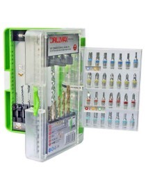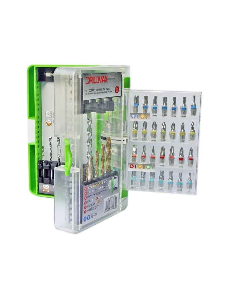 SET 59 PEZZI COMPLETO PER TRAPANO PER FORARE ED AVVITARE così composto:n° 7 Punte HSS+TIN per forare a sola rotazione acciaio e metalli ? 2-2,5-3-3,5-4-5-6 mm n° 6 Punte in WIDIA per forare a rotopercussione muro, cemento, materiali edili ? 3-4-5-6-8-10n° 40 inserti per avvitatoriPhillips - 4pcs L=25mm PH 0-1-2-3 + 3pcs L=50mm PH 1-2-3Pozi - 7pcs L=25mm PZ 0-1-2-3 + 6pcs L=50mm PZ 0-1-2-3Esagonali - 7pcs L=25mm CH 2-3-4-5-5,5-6Torx - 7pcs L=25mm TX 10-15-20-25-27-30-40Lama - 3pcs L=25mm TG 3-4-5 + 3pcs L=50mm TG 3-4-5n°5 chiavi a bussolan°1 portainserti magnetic ? q.c.