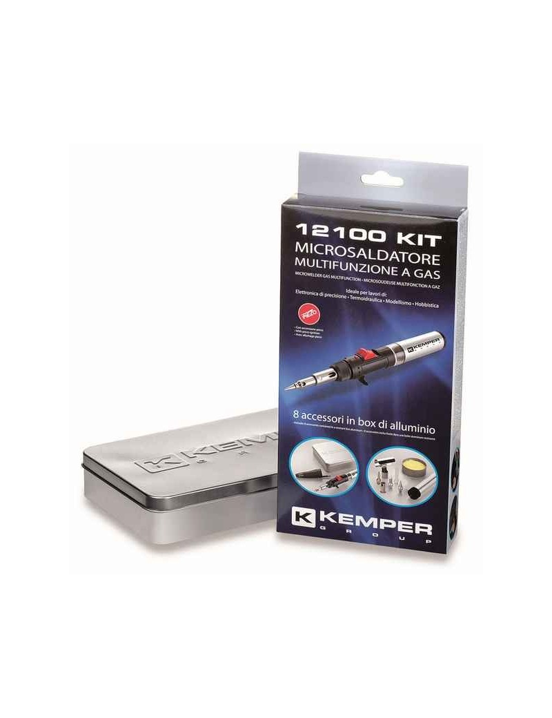 Kit microsaldatore professionale con corpo trasparente per verifica del livello del gas.Perfetto per saldatura, pirografia e taglio a caldo.Completo dei seguenti accessori: coltello per tagliare, cannello piatto, deflettore, testa soffiante, rotolo di stagno e spugnetta di pulizia.