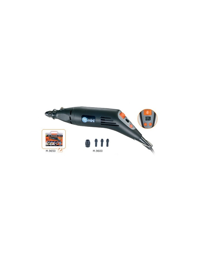Mandrino autoserrante per agevolare il cambio degli accessori.Display digitale/controllo velocità per lavorazioni più precise sui diversi materiali.Corpo ergonomicamente progettato per una comoda impugnatura.Motore potente e velocità variabile per svariate applicazioni. Pulsante di blocco albero.Dotato di 3 pinze assortite (d. 2,35 - 3,0 - 3,2 mm) e 1 ghiera per una maggiore flessibilità.Non richiede trasformatore.Voltaggio 230V / 50HzPotenza 170 WattVelocità a vuoto 8.000-32.000 RPMTipo di mandrino autoserrante Capacità mandrino d. 0,4-3,2 mmLunghezza cavo 1,9 mPeso 665 g