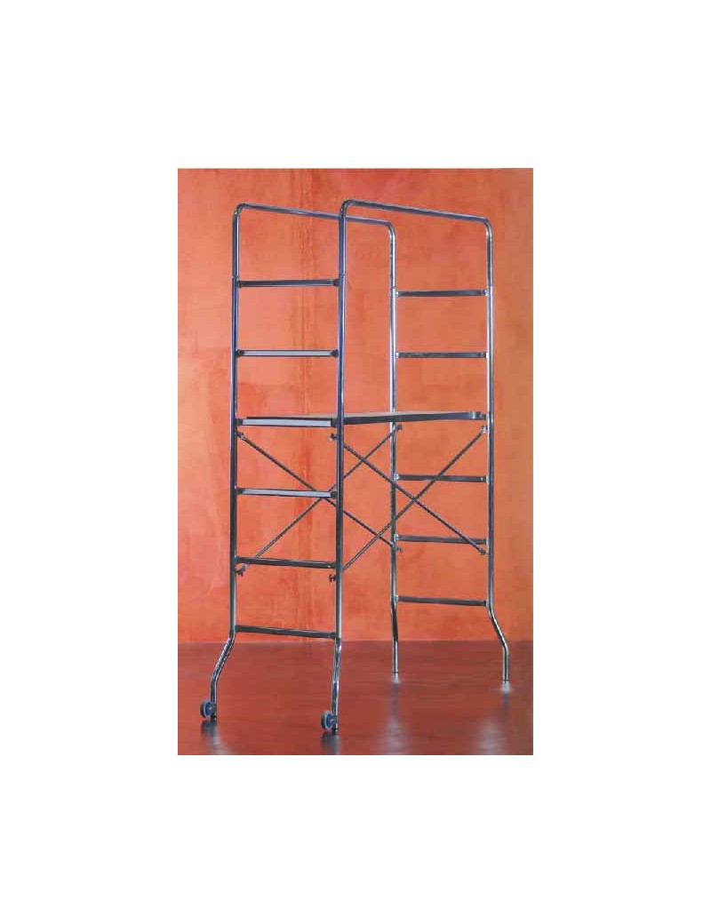 Realizzato in acciaio zincato; completamente smontabile.Studiato per lavori hobbistici, imbiancatura o piccole manutenzioni, veloce nel montaggio e nello smontaggio, minimo ingombro, dimensioni confezione cm 200x60x10.Montanti: in tubo di acciaio tondo ? mm 30.Caratteristiche:Altezza massima: m 2,18Ingombro: m 0,65x1,69Portata: kg 120Peso: kg 25 (compreso un piano)Confezionato in film termoretraibilePiano di lavoro inclusoDotati di ruote per facilitarne lo spostamentoCompleti di istruzioni per il montaggioChiavi e istruzioni per il montaggio delle ruote.